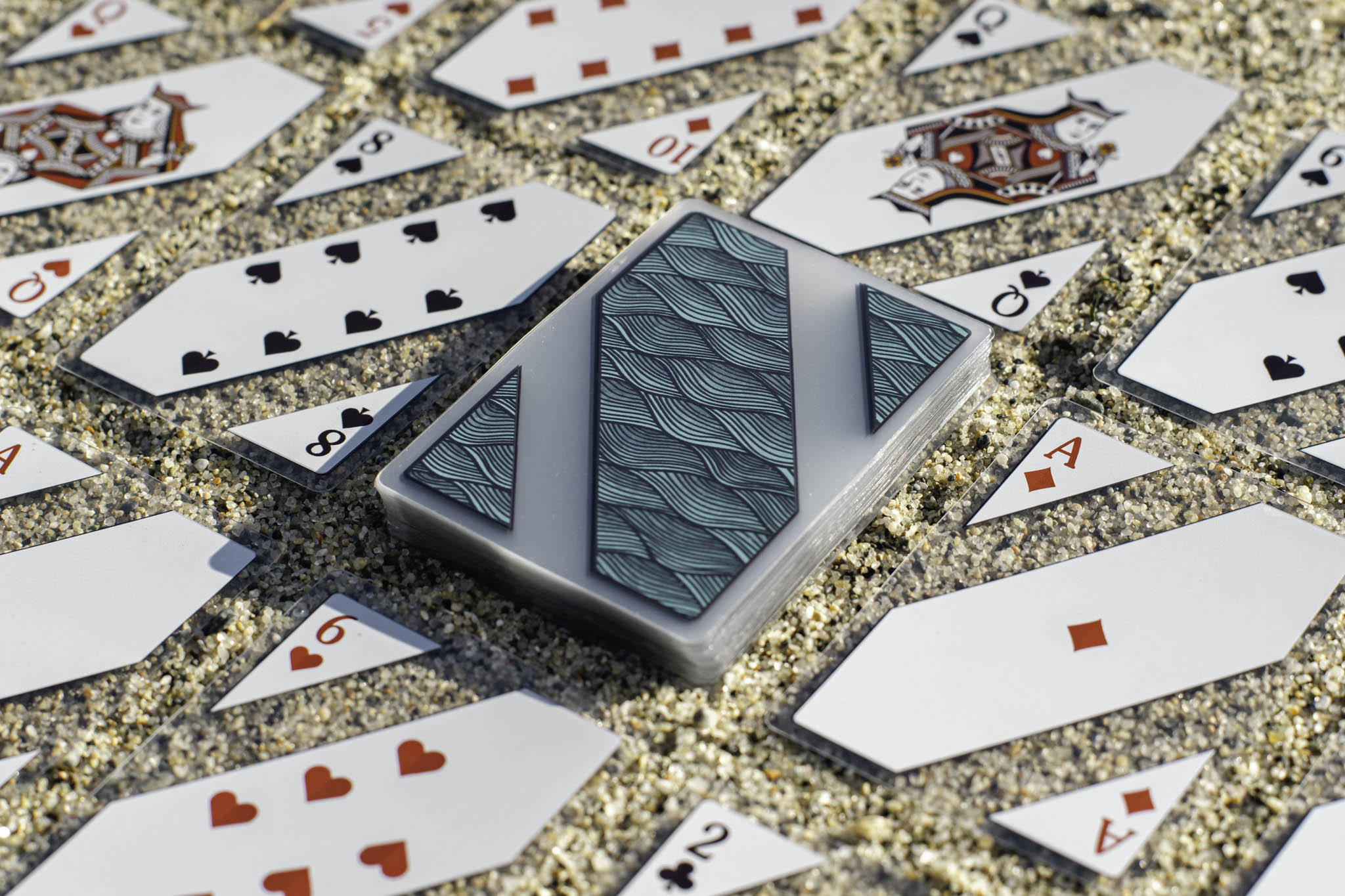 A unique teal design that was selected as a fan-favorite on a clear plastic playing card. We wanted to keep the design minimalist to hightlight the card's transparency.